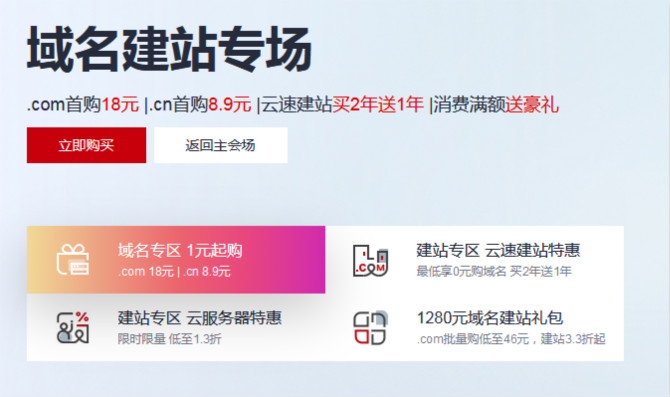 提供建站组合特惠,买云速建站最低享0元购域名,买2年送1年,云服务器+域名组合特惠低至1.3折