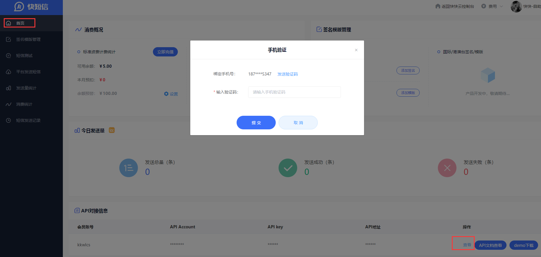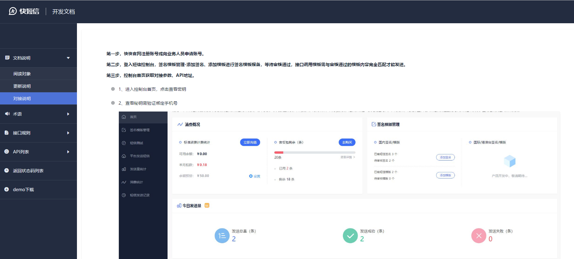 API对接信息、对接文档及demo可在快短信控制台首页查看及获取,目前仅支持一户一路接入。