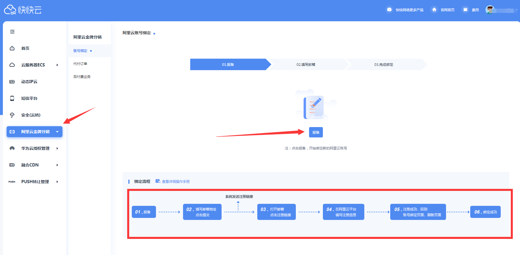 或者直接右上角登录控制台进入阿里云分销账号关联页面。