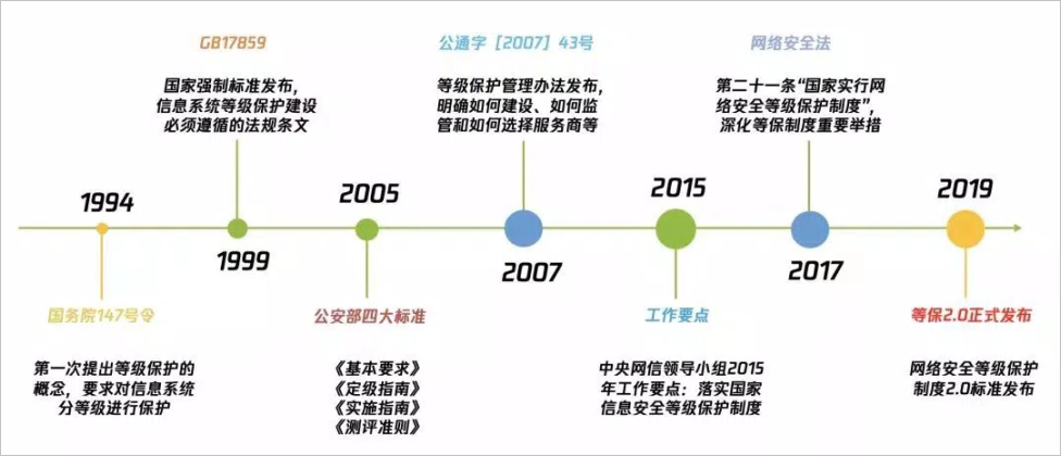 等保2.0是指网络安全等级保护制度2.0国家标准,该标准已于2019年5月13日正式发布,并于2019年12月1日正式实施。目前58%的国家已制定国家网络安全战略,主要国家和地区都已制定专门的网络立法。等保2.0的发展和演进史如下图所示。