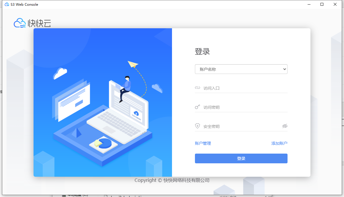 2.解压S3 Web Console,单击KK-OSS.exe文件,填写访问入口,访问密钥和安全密钥,选择登录。