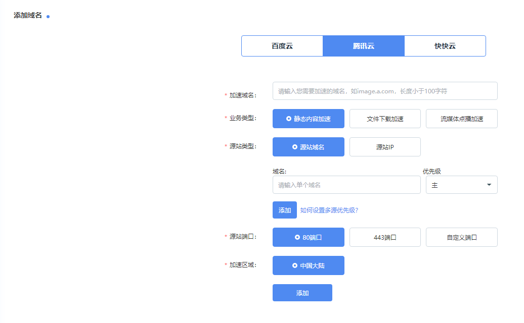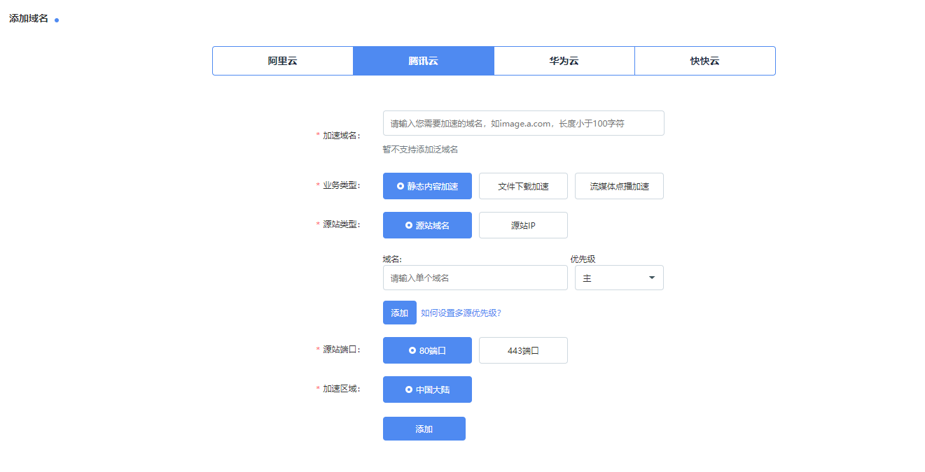 3. 配置加速域名、业务类型、源站类型、源站端口、加速区域