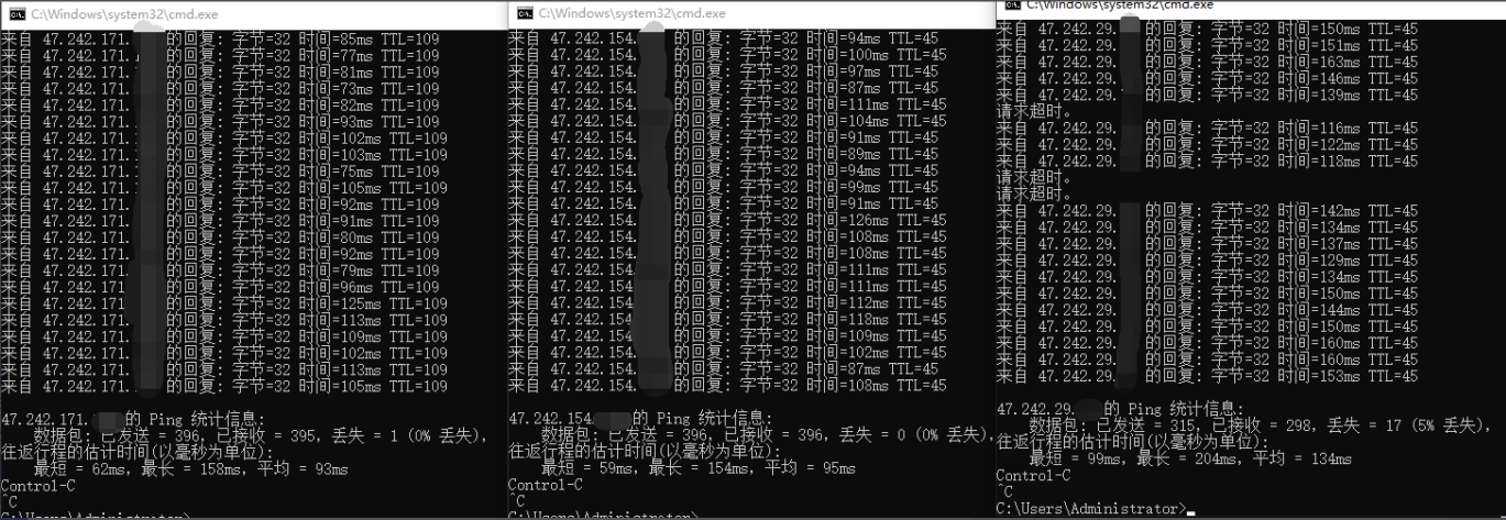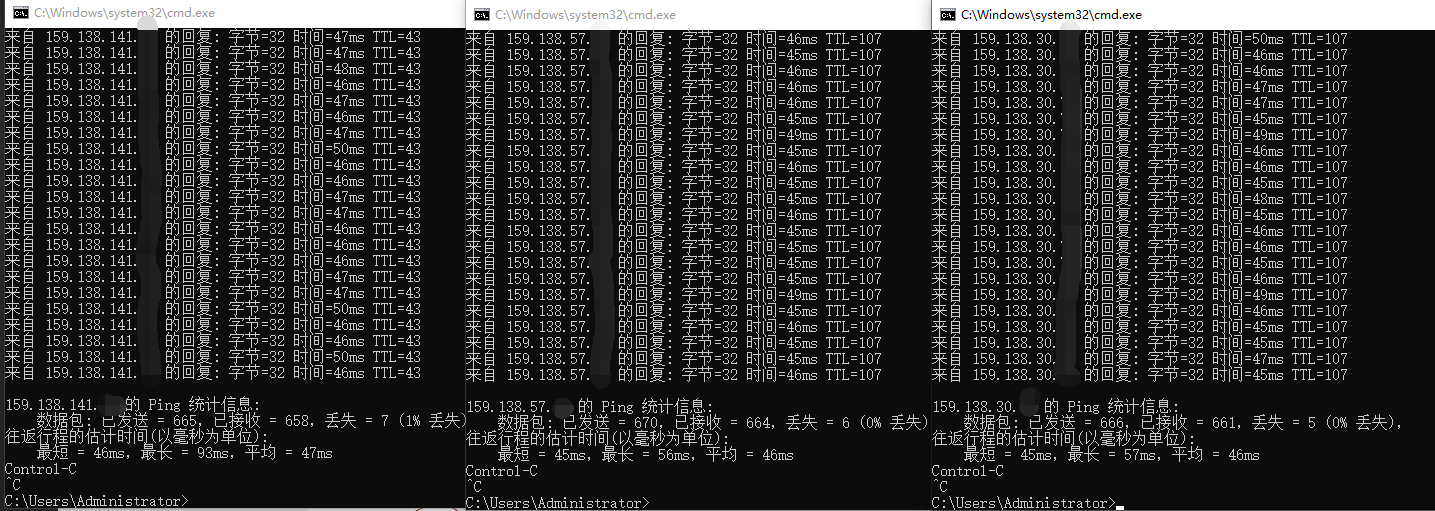 华为云:最低时延45ms,最高93ms,平均47ms,每个段都会有概率丢包