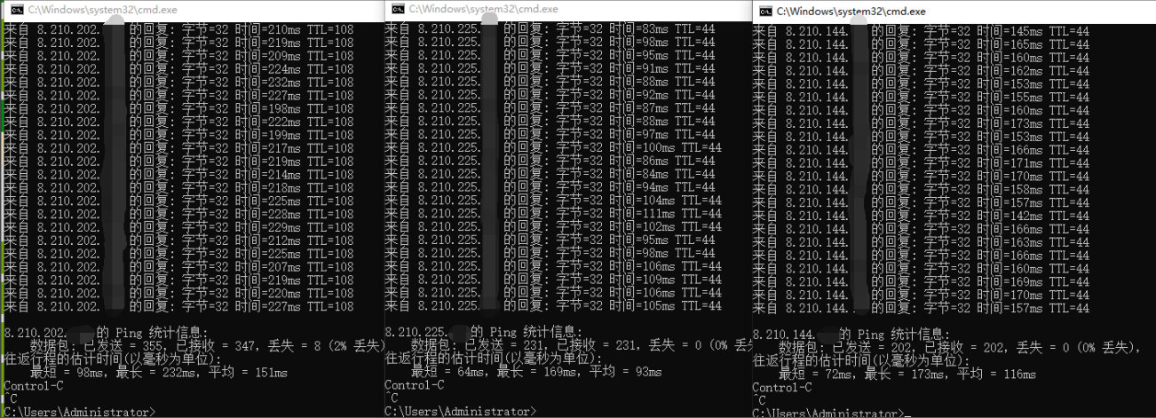 8.210段:最低时延64ms,最高232ms,平均119ms,丢包率较好