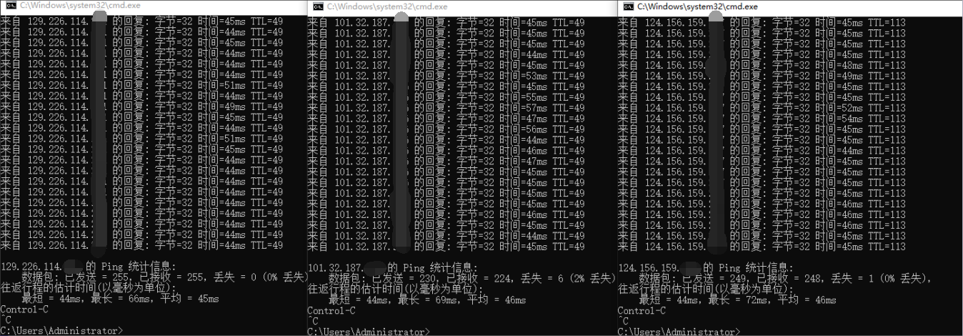 腾讯云:最低时延44ms,最高72ms,平均46ms,丢包率小