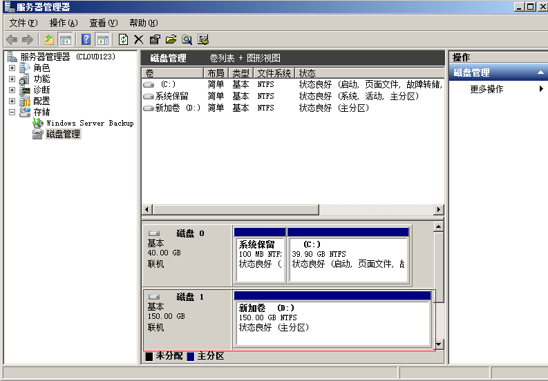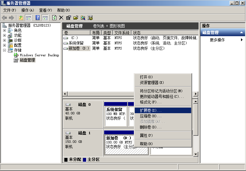 数据盘原有容量为100GB,通过管理控制台将数据盘扩容50GB后,登录云服务器将50GB新增容量增加到D盘中。操作完成后,D盘有150GB的空间可用作数据盘。