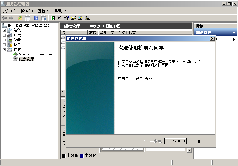 5. 在弹出的“扩展卷向导”界面中选择“下一步”,如图所示。图 扩展卷向导(Windows 2008)