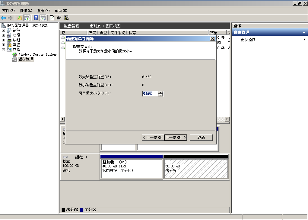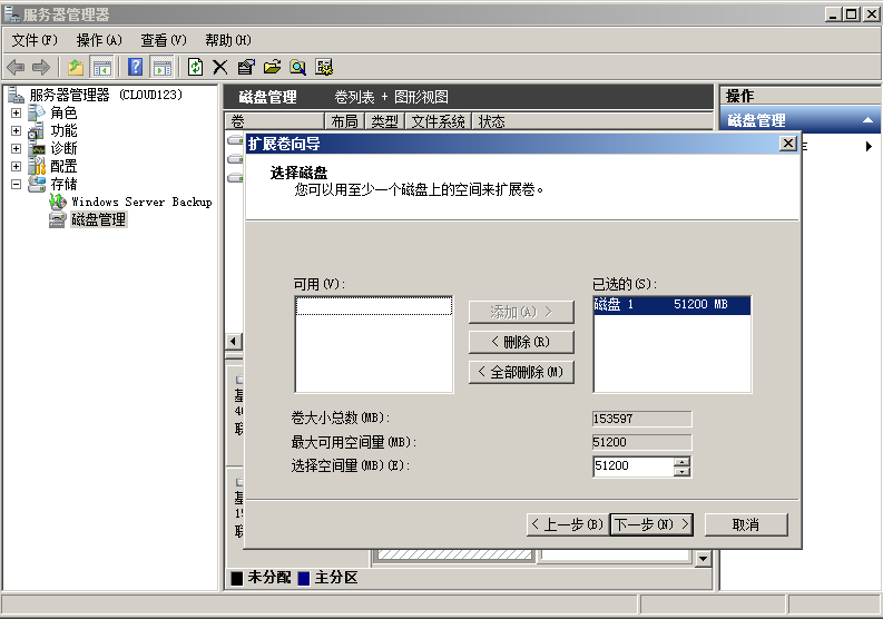 6. 在弹出的“扩展卷向导”界面中的“选择空间量(MB)(E):”行中输入需要扩容的磁盘容量,单击“下一步”,如图所示。图选择空间量(Windows 2008)