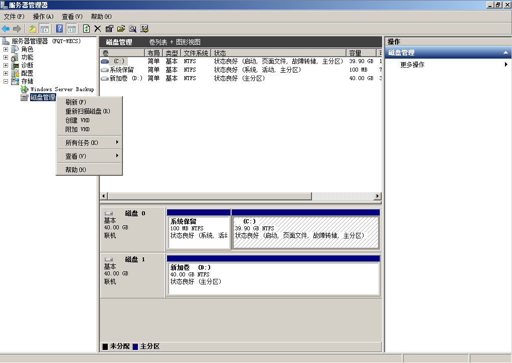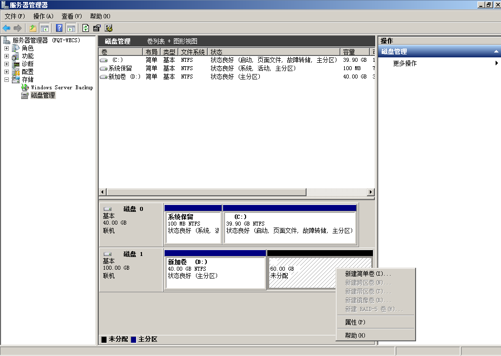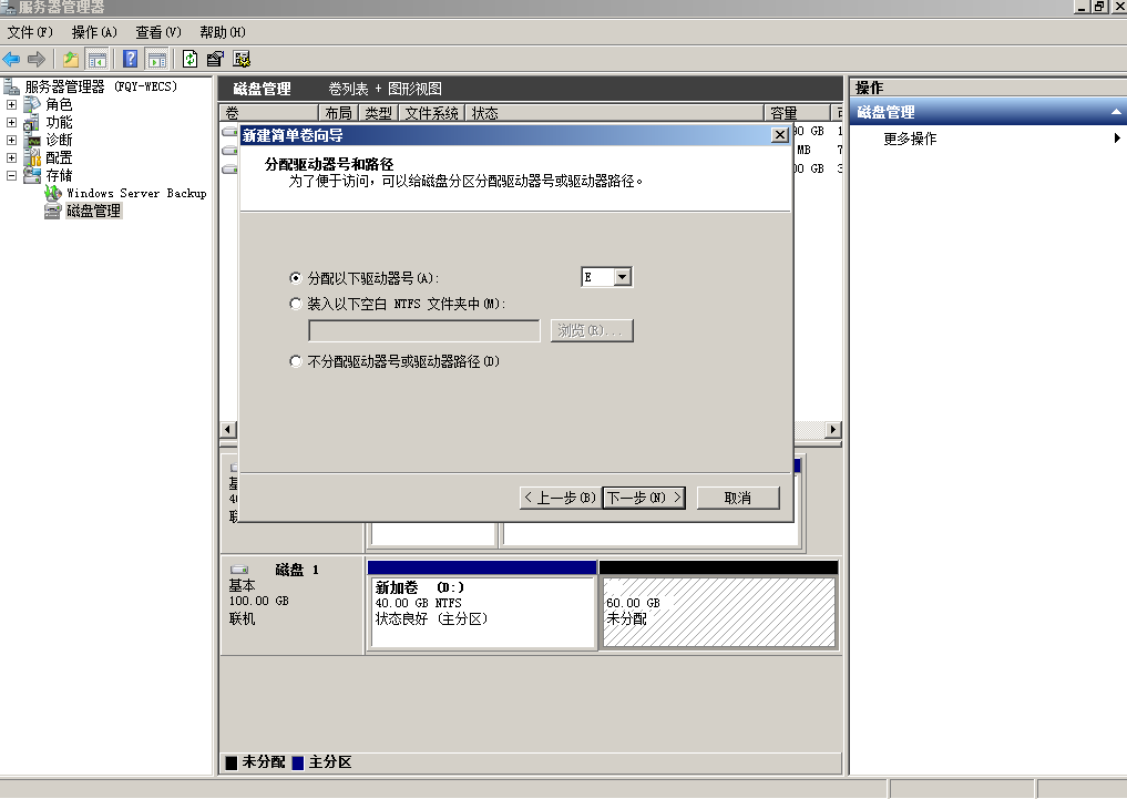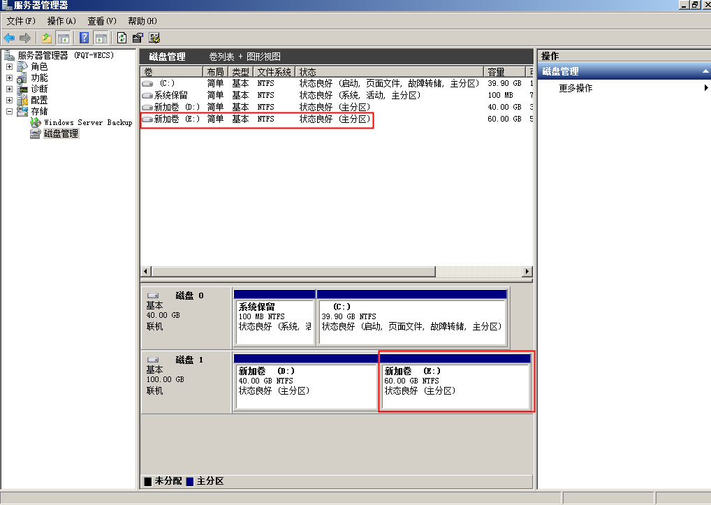 数据盘原有容量为40GB,通过管理控制台将数据盘扩容60GB后,登录云服务器为60GB新增容量新创建一块E盘。操作完成后,新增60GB的E盘可用作数据盘。
