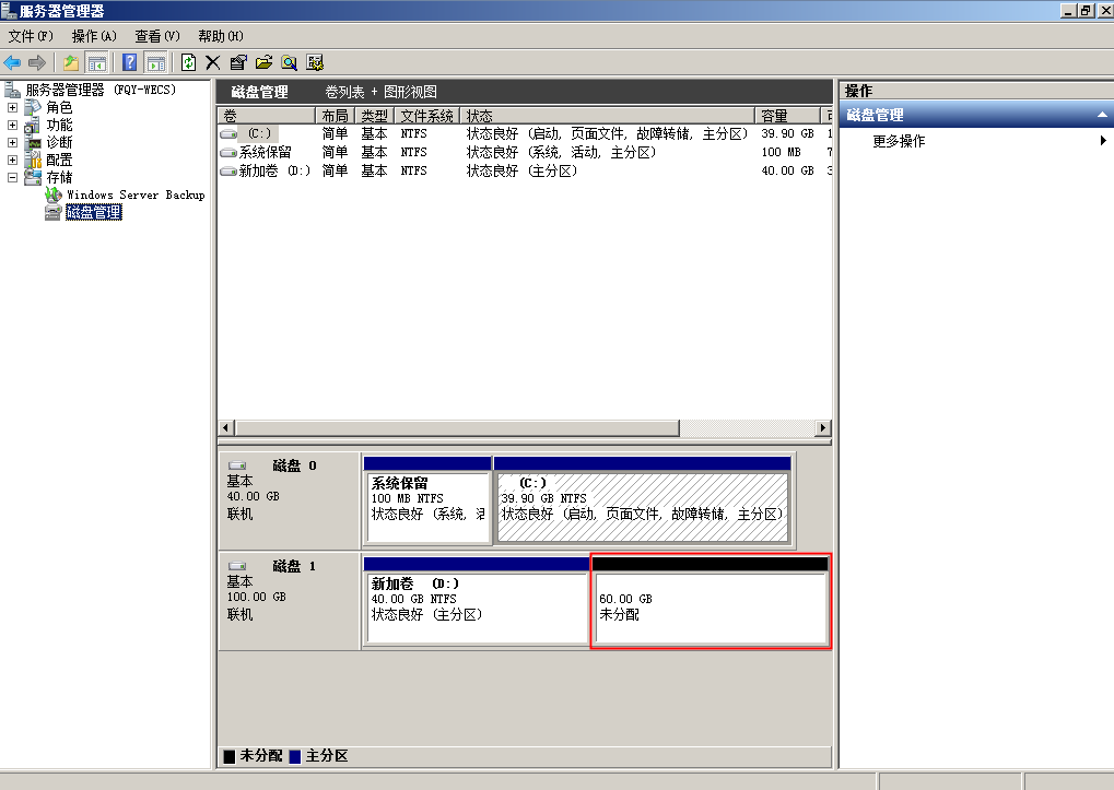 刷新后,可以看到在扩容部分的容量,显示为“未分配”,如图所示。图 未分配(数据盘)