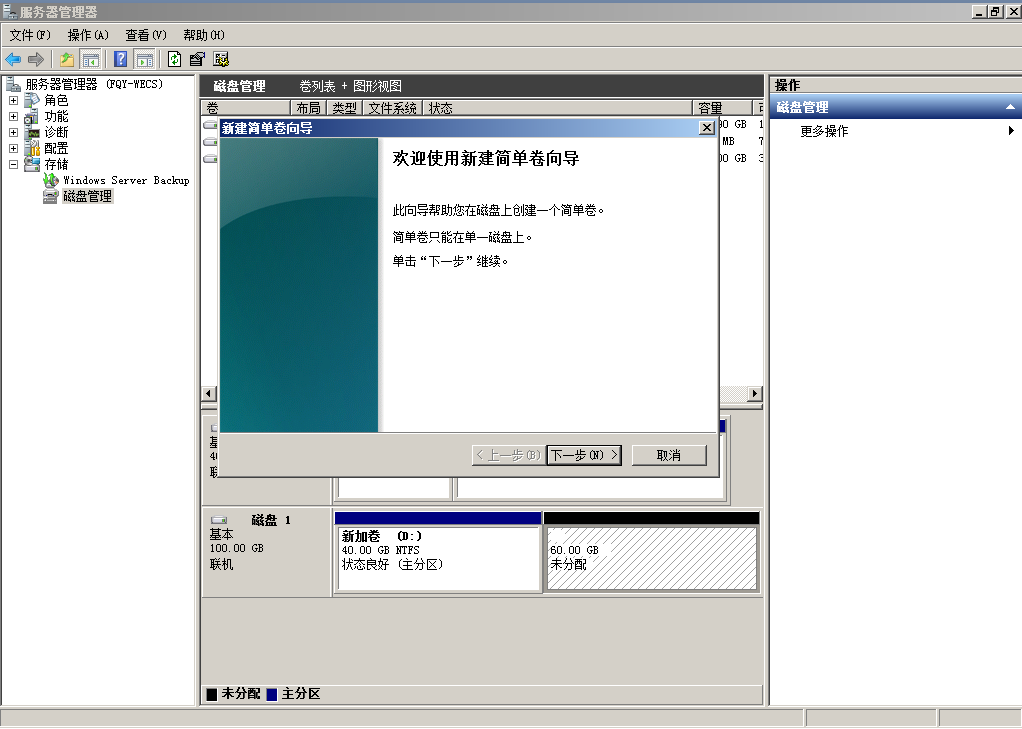5.在弹出的“新建简单卷向导”界面中选择“下一步”,如图所示。图新建简单卷向导(数据盘)