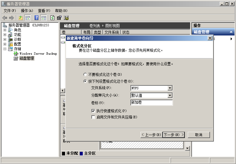 8. 勾选“按下列设置格式化这个卷”,并根据实际情况设置参数,格式化新分区,单击“下一步”完成分区创建,如图37所示。图37 格式化分区(数据盘)勾选“按下列设置格式化这个卷”,并根据实际情况设置参数,格式化新分区,单击“下一步”完成分区创建,如图所示。图格式化分区(数据盘)