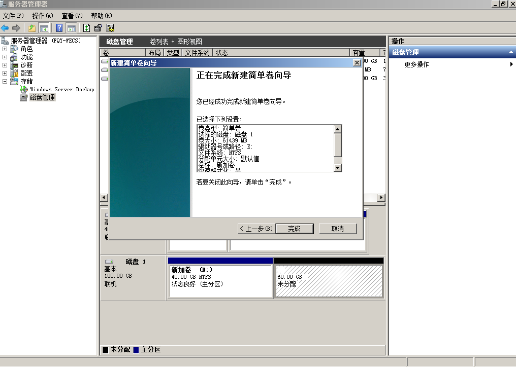 9. 单击“完成”完成向导。扩容成功后可以看到新加卷(E:),如图所示。图完成(新加卷E)