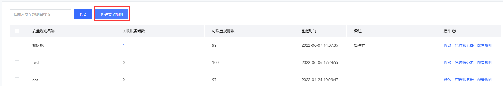3、点击创建安全规则,填写安全规则名称及备注,同时直接开始添加安全规则条数。