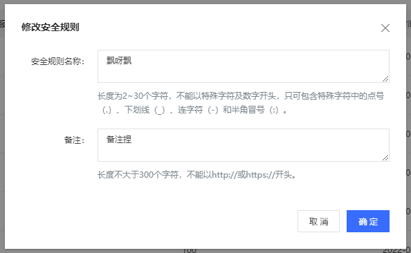 5、点击安全规则操作列表中修改,对安全规则名称和备注进行修改。