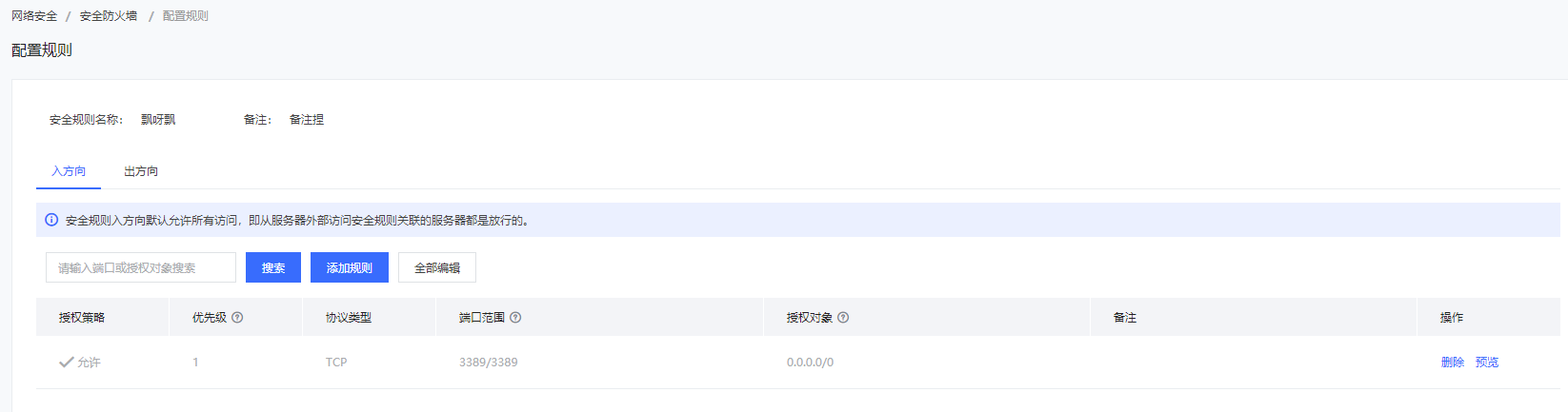 Ø 安全规则默认访问策略:出入方向均允许所有访问请求,您可按需手动添加允许或拒绝策略的规则。