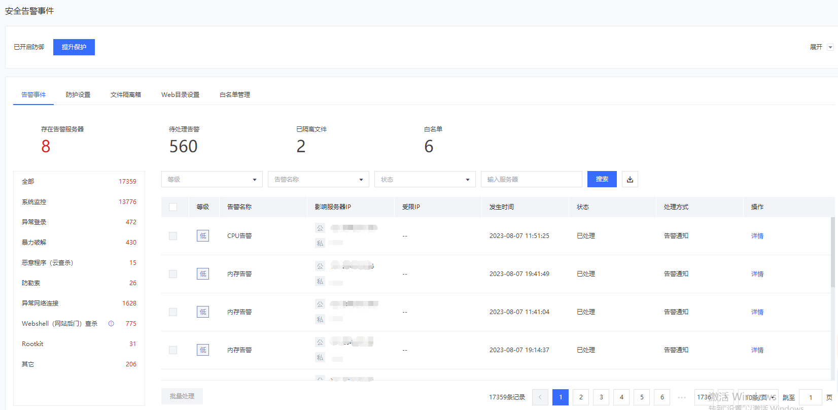 3、在安全告警事件页面,定位到目标告警事件,单击操作列的详情或者处理。