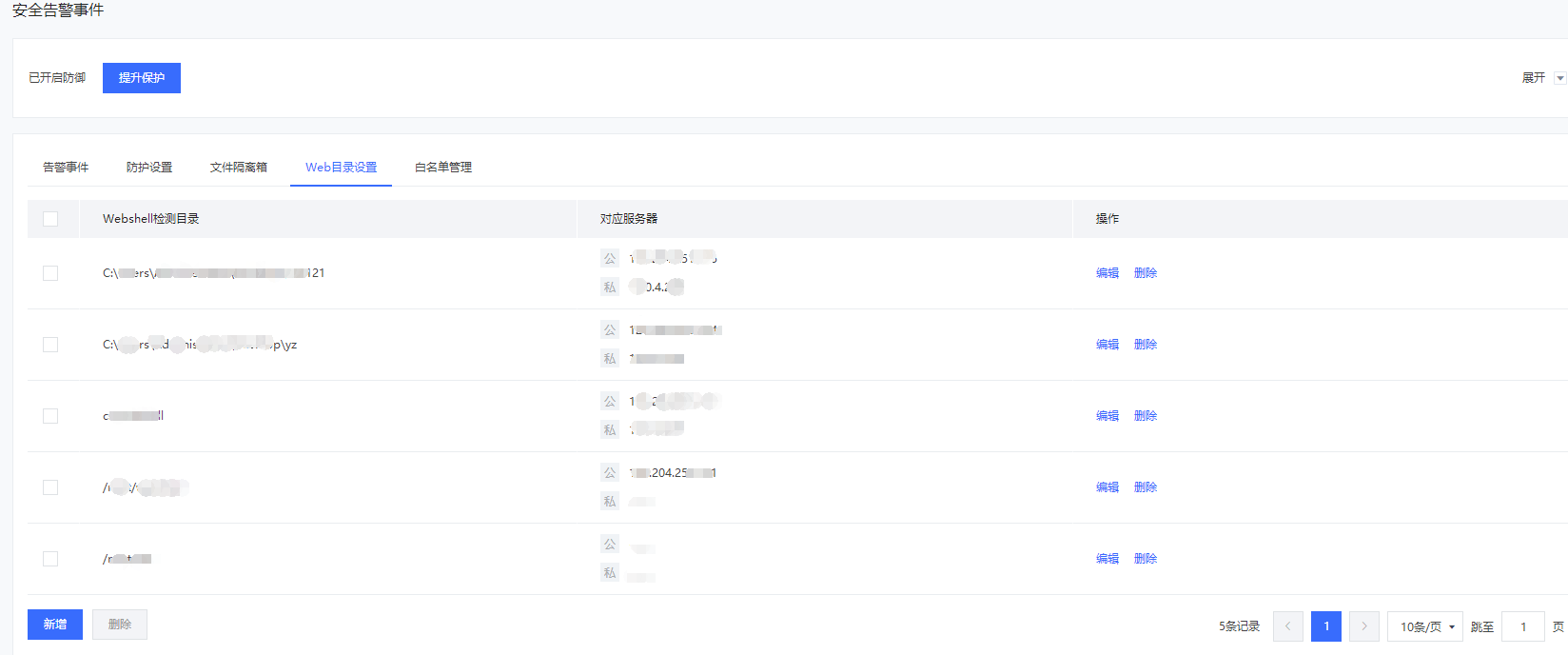 对于需要对网站进行webshell(网站后门)的检测,您需要在Web目录设置中先进行设置需要检测的网站目录及对应服务器。