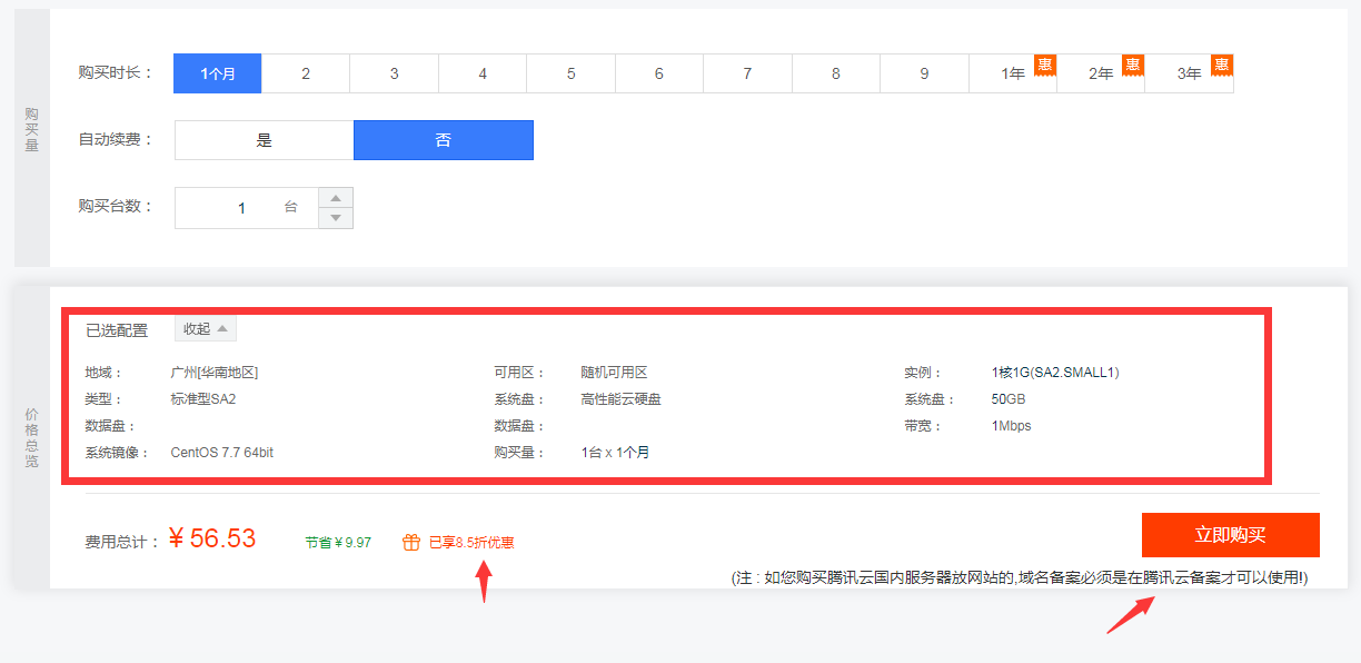 参考例子:(提示,若需要自动续费,可以勾选,且选择的实例类型、地域等都会影响最终价格。)