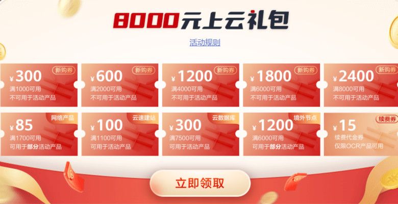 3、规则说明:新购优惠券(满1000减300、满2000减600、满4000减1200、满6000减1800、满8000减2400)不可叠加页面活动商务,可用于用户下单、按需转包周期、变更场景使用,订单时长限1年及以内,限于包月、包年、一次性计费类型;
