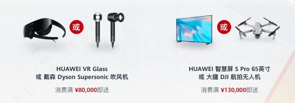 消费满130000,赠送华为智慧屏 S Pro 65英寸或者大疆 DJI 航拍无人机